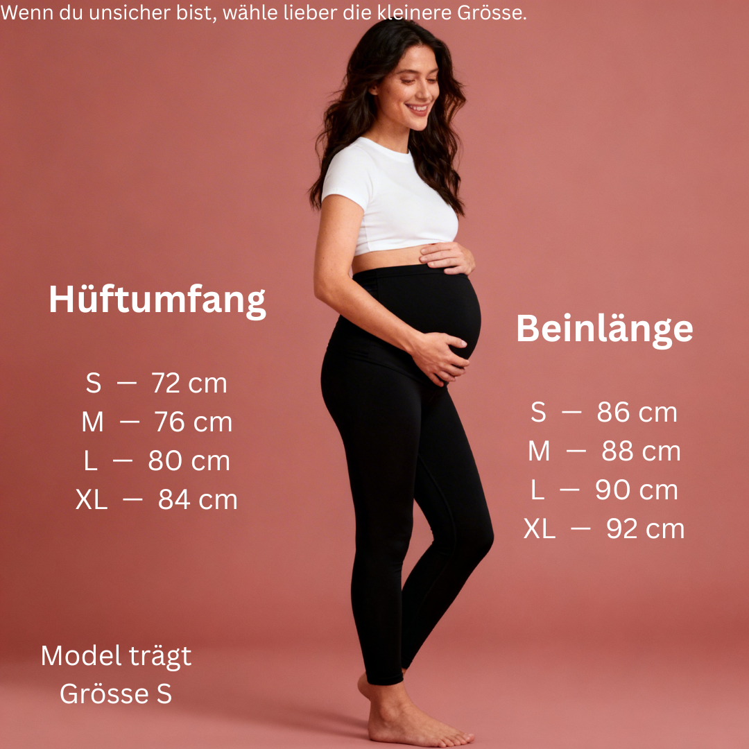 Wähle einfach deine normale Grösse von vor der Schwangerschaft. Die Livelia Leggings ist dehnbar und passt sich deinem Bauch flexibel an, du musst keine grössere Grösse bestellen. Wenn du zwischen zwei Grössen bist, empfehlen wir die kleinere.